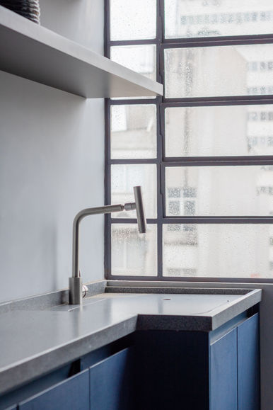 A principal mudança foi a remoção da parede que separava a cozinha da sala, criando uma integração entre os ambientes. Com isso, a circulação se tornou mais fluida, e o apartamento ganhou uma sensação de amplitude, essencial para espaços compactos. A escolha de materiais e cores também foi pensada para trazer sofisticação e praticidade ao dia a dia. Na cozinha, os tons de cinza e azul criam um contraste elegante, enquanto a bancada em granito escovado se estende ao frontão, dando continuidade ao visual moderno.