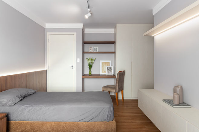 A suíte de visitas segue a mesma linha de design, com um ambiente clean e linear. A cabeceira, em marcenaria sob medida, complementa a iluminação indireta, criando uma atmosfera acolhedora e moderna.